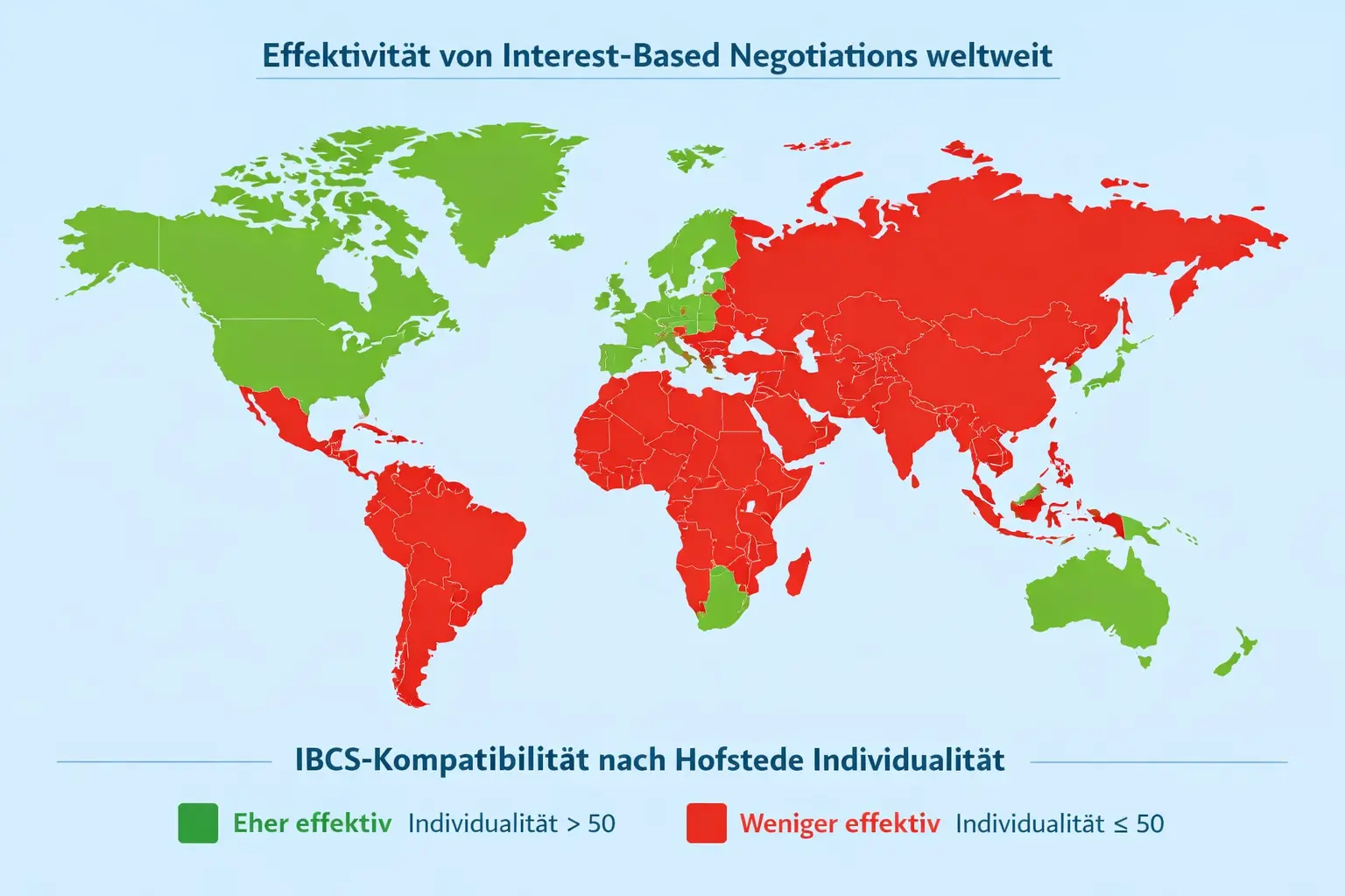 Grundlage ist der Hofstede-Individualismus-Index (IND) als Proxy für die kulturelle Anschlussfähigkeit an interessenbasierte Verhandlungsansätze.